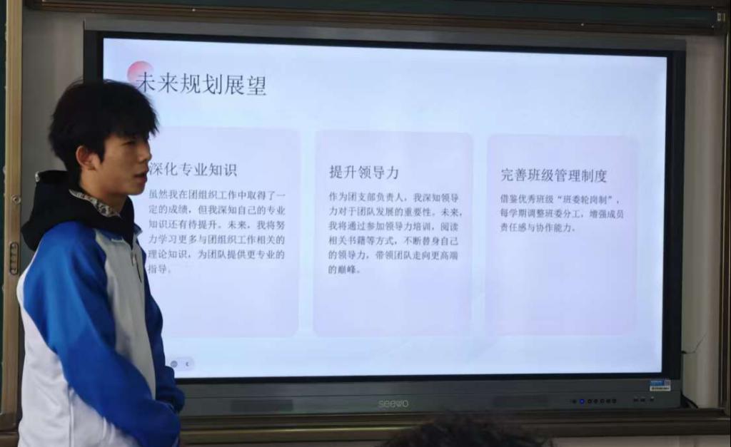 在述职环节中,各团支书通过PPT 图文图表 视频等方式讲述主题团日活动的开展,志愿服务和社会实践等内容,总结本学期取得的工作成果,以及工作中存在的不足,同时在此基础上为下学期的工作进行了规划和展望。